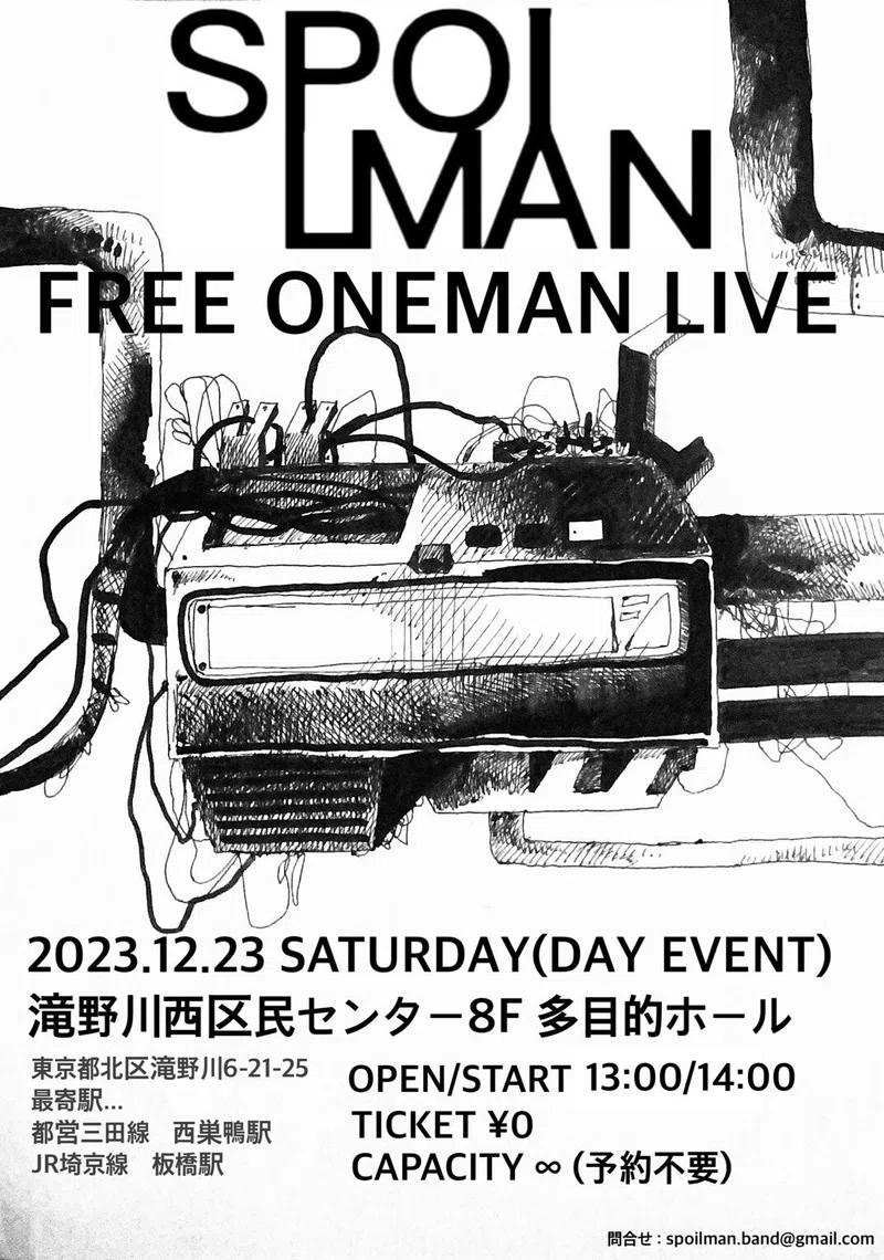 昨年12月に東京都内のある公民館をレンタルして開かれたSPOILMANによるフリーワンマンライブ。入場無料でDIY感に溢れたステージがロケーションからして最高。本当に普通の公民館で児童センターでもあるので、入り口では子供向けのかわいらしい看板が出迎えてくれたり、下の階で囲碁やカラオケ大会が開かれていたり、元々ファンではないたまたま通りかかった地元民が見に来ていたり、SPOILMANが持っている狂気的な音楽性の中で垣間見えるユーモアやシュールさとも完璧にマッチした会場だったと思います。演奏の方はとてつもなく熱が籠っていて、昨年2枚組のアルバムリリース後全国ツアーを回っていたのもあってライブ活動を繰り返した先での最高のコンディション、特別なロケーションもあってこちらとしてもずっと高揚感があり、まさに2023年SPOILMANの活動の総括とも言える集大成的な一日だったと思います。曲を解体していくかのようなバラバラなドラムがあのルームリバーブ満載の体育館で行われると今まで見たSPOILMANのどのライブよりも凄まじい生音感があり、ランダム性があるようでバンド全体でキメを挟むときはぴったり呼吸が一つになる練度たっぷりのフリーキーなアンサンブルは本当に圧巻。